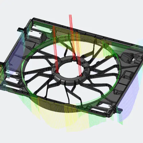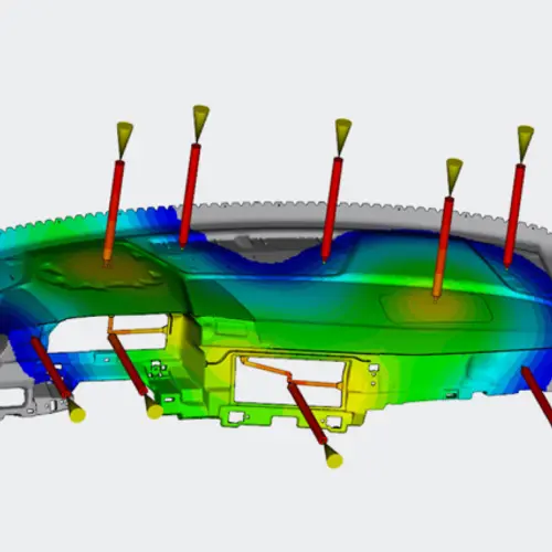 Filling simulations and warpage calculations simulate the flow of plastic in a mould. This means that injection points and process parameters can be optimised and component weaknesses can be identified at an early stage. Warpage simulation is often particularly necessary for complex parts with fibre reinforcement as a large degree of distortion will mean that the component needs to be changed.