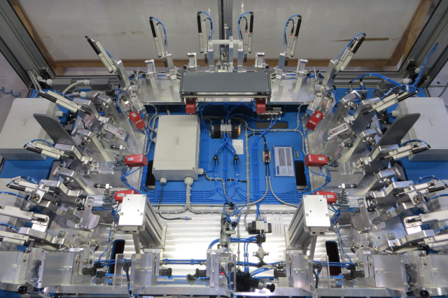 Pneumatic/sensor-controlled test jig for 100% monitoring in series operation.
